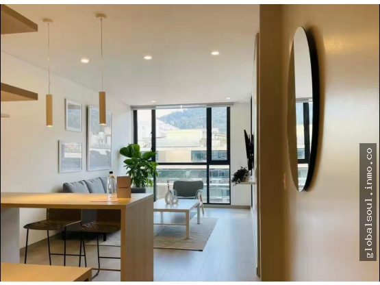 Elegante apartamento amoblado, ubicado en un sector de empresas, embajadas y restaurantes a una cuadra de la cra 11. Al ingresar hay un hall, un cómodo baño social, espacio para un estudio, cocina integral americana con mesón, zona de lavandería, luego encuentra la sala con salida a un balcón amplio. Cuenta con una habitación cómoda con walking closet y baño. El edificio tiene gimnasio, terraza para BBQ y parqiueaderos para visitantes.